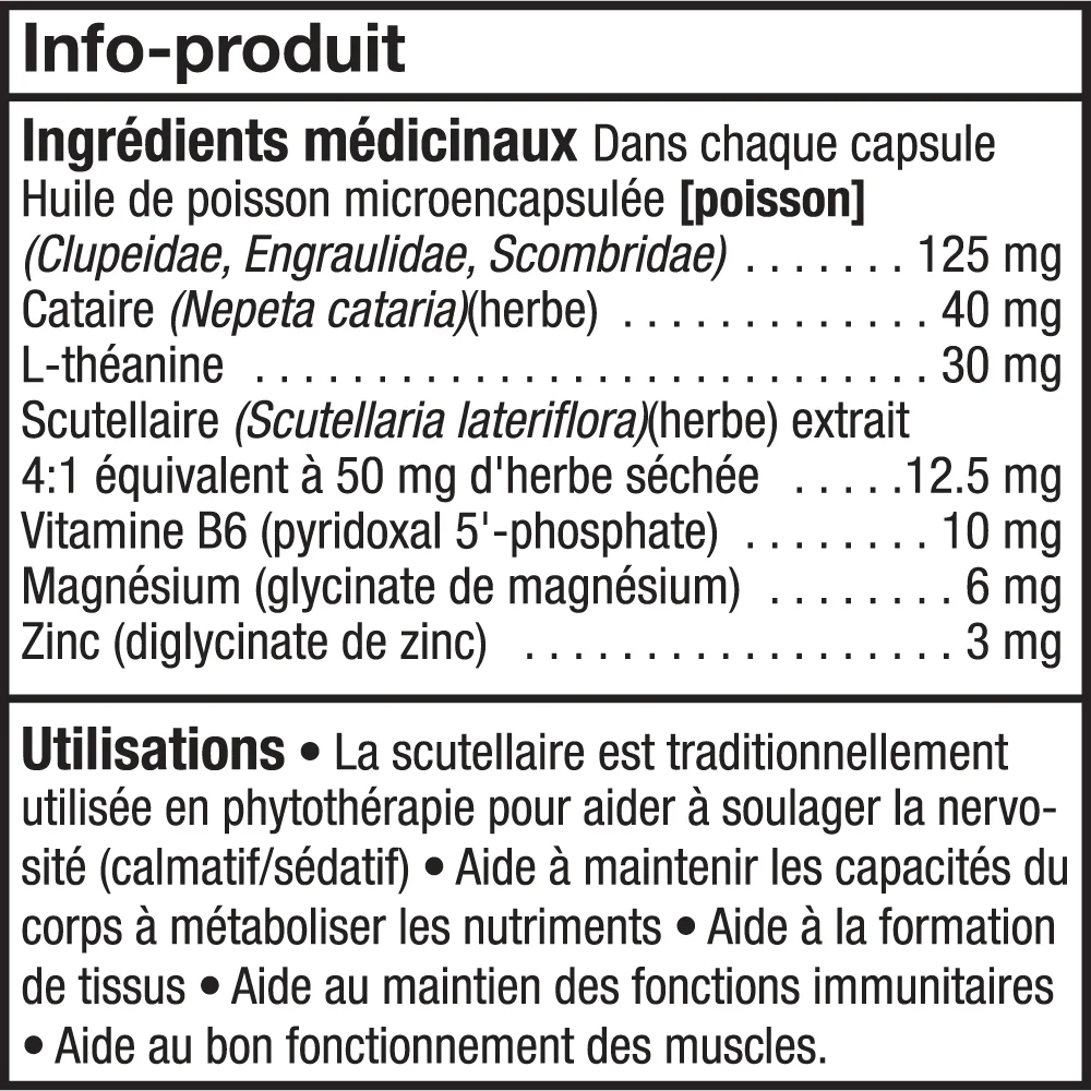 Consulter un professionnel de la santé si les symptômes de nervosité / agitation persistent ou s’aggravent. La consommation de ce produit en association avec des médicaments ou des produits de santé naturels ayant des effets sédatifs n’est pas recommandée. Ne pas utiliser si vous êtes enceinte ou si vous allaitez. Certaines personnes peuvent se sentir assoupies.